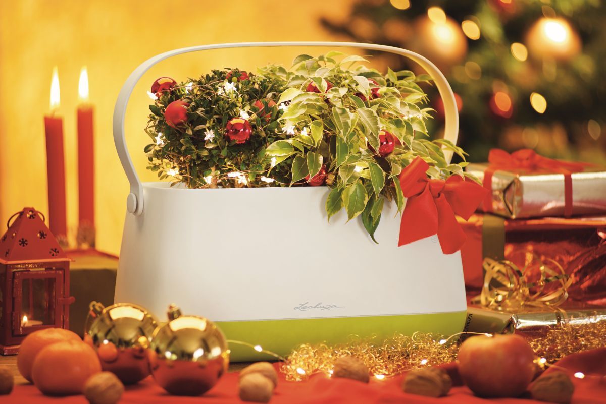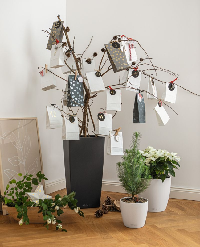 Pictured right, upcycling is taken to another level with the help of a tall and elegant CUBICO planter from Lechuza and branches decorated with Christmas cards, baubles and small Secret-Santa gifts. Priced at £150.42, this premium self-watering planter is built to last and will carry on looking its beautiful best for years to come. Suitable for use either indoors or outside.