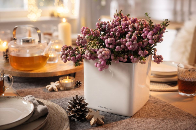 Distinctive, decorative and resilient, there are about 15 species of Snowberry, most of which are native to north and central America. The berries for which this pretty plant is famed grow in densely packed clusters which makes them ideal for use in winter bouquets, as festive adornments or displayed in their own right as pictured here. Once again the gorgeous glossy Cube planter offers the perfect backdrop for a winter wonderland scene.