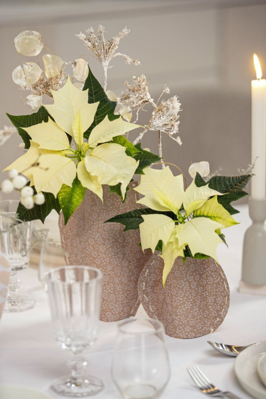 Starry sparkle for your festive table: Cream-coloured poinsettias look really elegant in upcycled vases made from small glass bottles covered in glittery wallpaper. Other florals such as honesty pods (Lunaria annua), snowberry (Symphoricarpos albus) and white sprayed asparagus are a perfect match. They complement this homemade arrangement and give it a stylish, wintry touch. Image by Stars for Europe.